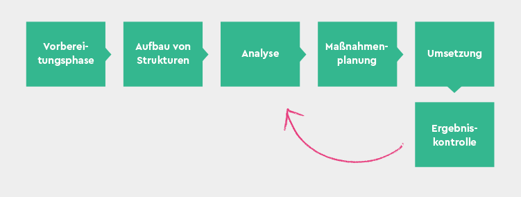 Unternehmen, die mit einem BGM-Prozess planvoll vorgehen, werden die besten Ergebnisse erzielen. Erfolgsfaktoren sind der Einbezug aller Mitarbeitenden und Führungskräfte und ein strukturelles Vorgehen bei der Einführung: Der Prozess beginnt mit der Analyse, gefolgt von der Durchführung der gesundheitsfördernden Maßnahmen bis hin zur Evaluation. Unser Praxisbeispiel der swb AG zeigt z. B. die Schlüsselrolle der Führungskräfte auf. Um ein nachhaltiges BGM in Ihrem Haus zu implementieren, empfiehlt es sich, folgende idealtypische Phasen zu durchlaufen.