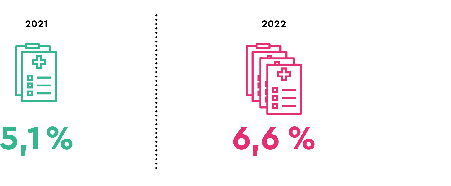 • Der Krankenstand ist mit 5,1 Prozent in 2021 und 6,6 Prozent 2022 deutlich angestiegen.