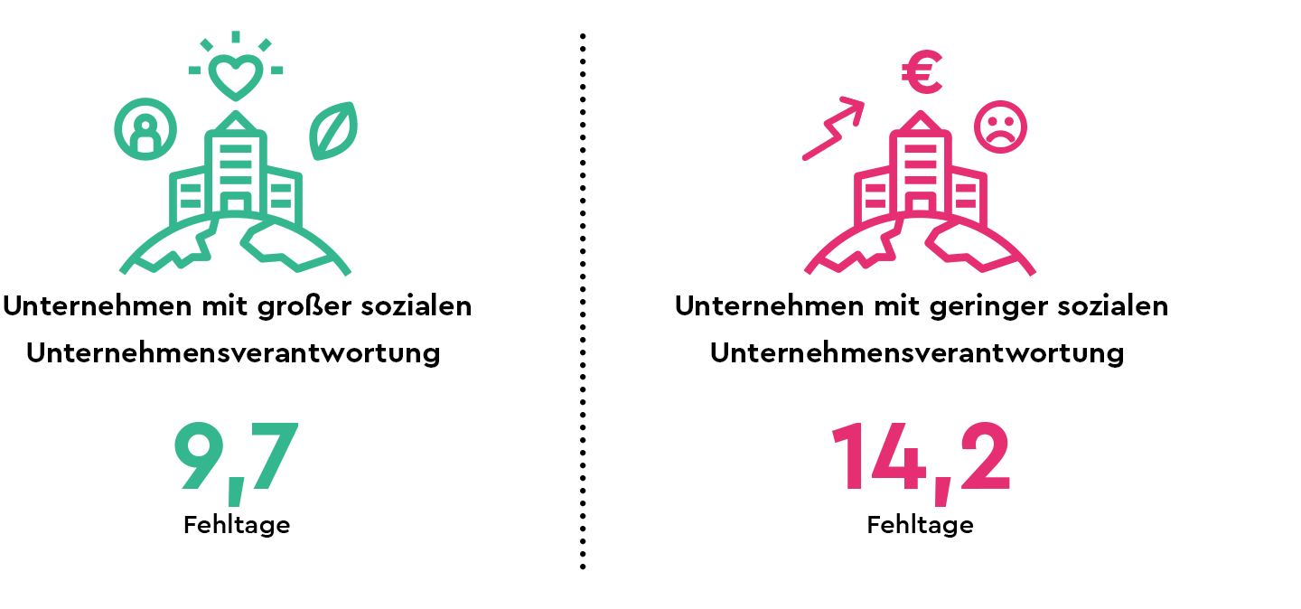 • Durchschnittlich fehlten Beschäftigte, in Firmen mit großer sozialer Unternehmensverantwortung, 4,5 Tage weniger.