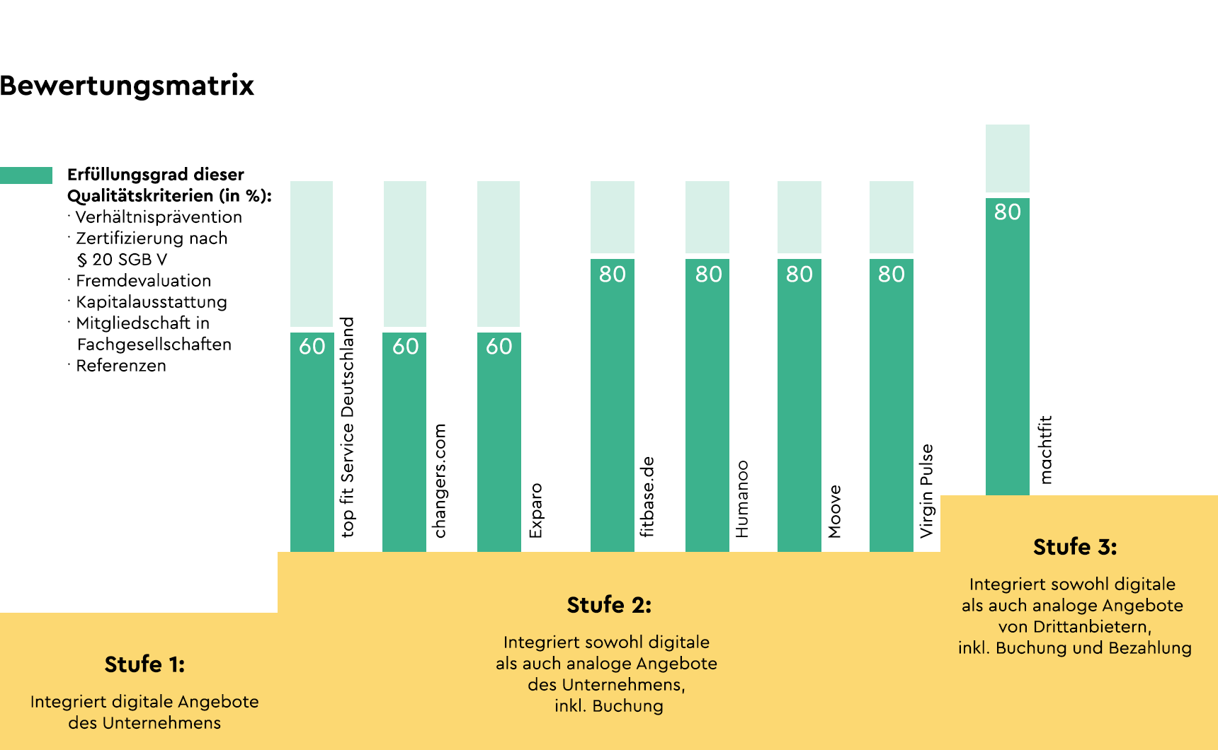 Die Gesundheitsexpertin Stephanie Widmaier und der Professor für Gesundheitsmanagement Dr. Volker Nürnberg unterscheiden im Personalmagazin erschienenen Artikel in drei Abstufungen, wie gut BGM-Angebote in digitale Lösungen integriert werden können. Unter allen untersuchten BGM-Anbietern konnte dabei nur machtfit die dritte Stufe erreichen und mit einem optimalen Integrationsgrad von Gesundheitsangeboten in die eigene digitale Plattform überzeugen. Darüber hinaus konnte das Unternehmen die wissenschaftlichen Qualitätskriterien zu 80% erreichen und damit am stärksten erfüllen.