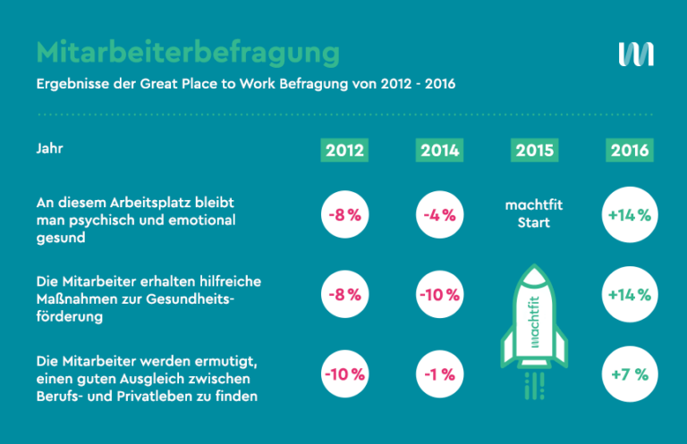 2015 ist Tyczka Energie unter anderem mit der machtfit-Plattform gestartet. Der Punkt »Die Mitarbeiter erhalten hilfreiche Maßnahmen zur Gesundheitsförderung« stieg um 14 % im Vergleich zum Jahr 2014. Die Mitarbeiter können aus eigenen Firmenangeboten und Angeboten aus dem machtfit-Partnernetzwerk wählen. Lesen Sie das gesamte Interview mit Herrn Schwarz auf unserem Blog nach.