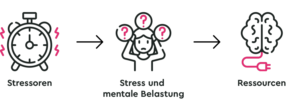 Wenn mehr von uns gefordert wird als wir leisten können, kommt es zu Stress. Stress ist ein Negativzustand, der aus der Bewertung einer Situation entsteht. Er wird durch Stressoren ausgelöst, und durch Ressourcen, also Schutzfaktoren, beeinflusst. Wird der Mitarbeitende ständig fehlbeansprucht kommt es zu einer Vielzahl an Stressoren, sind die Schutzfaktoren, die Ressourcen aufgebraucht kommt es zu einer mentalen Belastung.