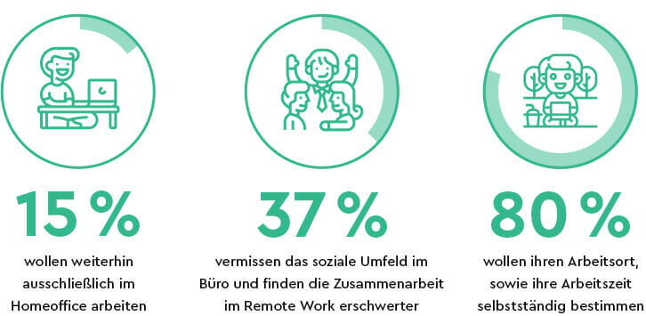 Was wünschen sich eigentlich die Mitarbeitenden und was wäre das Beste für Unternehmen und Beschäftigte? Laut einer Studie von Barco gaben nur 15 % an, nach Ende der Beschränkungen weiterhin ausschließlich im Homeoffice arbeiten zu wollen.3 37 % vermissen das soziale Umfeld im Büro und finden die Zusammenarbeit im Remote Work erschwerter.3 Gleichzeitig wollen jedoch alle Mitarbeitenden nach Bedarf die Möglichkeit haben flexibel zu entscheiden. Eine Umfrage von StepStone ergab, dass über 80 % der Beschäftigten ihren Arbeitsort, sowie ihre Arbeitszeit selbstständig bestimmen wollen.4 Auch wenn Mitarbeitende also selbst entscheiden dürfen, wird es bei den meisten ein Wechsel aus Homeoffice und Büro sein. Laut der Barco-Studie, liegt das ideale Gleichgewicht weltweit durchschnittlich bei 3 Tagen im Büro und maximal 2 Tagen pro Woche remote.3