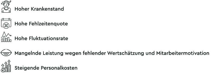All das hat Auswirkungen auf die Leistungsfähigkeit, die Kultur und das Image Ihres Unternehmens. Aber auch auf die Kosten, denn jeder Fehltag kostet das Unternehmen um die 400€, sodass es sich im Jahr auf mehrere Millionen aufsummieren kann.