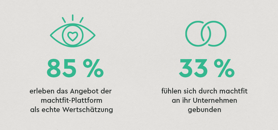 Die Stärkung der Mitarbeiterbindung durch Betriebliches Gesundheitsmanagement wurde dabei in der BGM-Wirksamkeitsstudie von machtfit und dem Umfragezentrum Bonn (uzbonn) wissenschaftlich belegt. Dafür wurden 1.538 in Deutschland tätige Mitarbeitende aus allen Funktionen und Hierarchien befragt, die sich mindestens einmal auf der machtfit-Plattform eingeloggt haben. Das Ergebnis ist eindeutig: 85 % der Befragten empfinden machtfit als deutliches Zeichen der Wertschätzung durch ihren Arbeitgeber und ganze 33 % fühlen sich durch machtfit stärker an ihr Unternehmen gebunden.