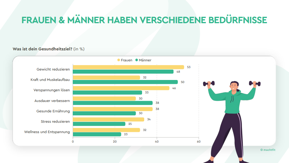 Bei den Gesundheitszielen zeigen sich klare Unterschiede: Kraft- und Muskelaufbau steht bei Männern mit 50 % auf Platz 1 (Frauen: 32 %), während „Stress reduzieren“ und „Verspannungen lösen“ bei Männern niedriger priorisiert sind. Beim Wohlbefinden geben 45 % der Männer Erschöpfung an – bei Frauen sind es 59 %. Die Erkenntnis: Holen Sie Männer dort ab, wo sie ohnehin Interesse zeigen, statt sie zu Themen zu zwingen, die sie nicht annehmen.